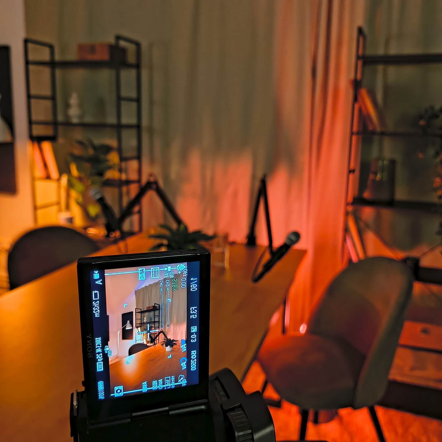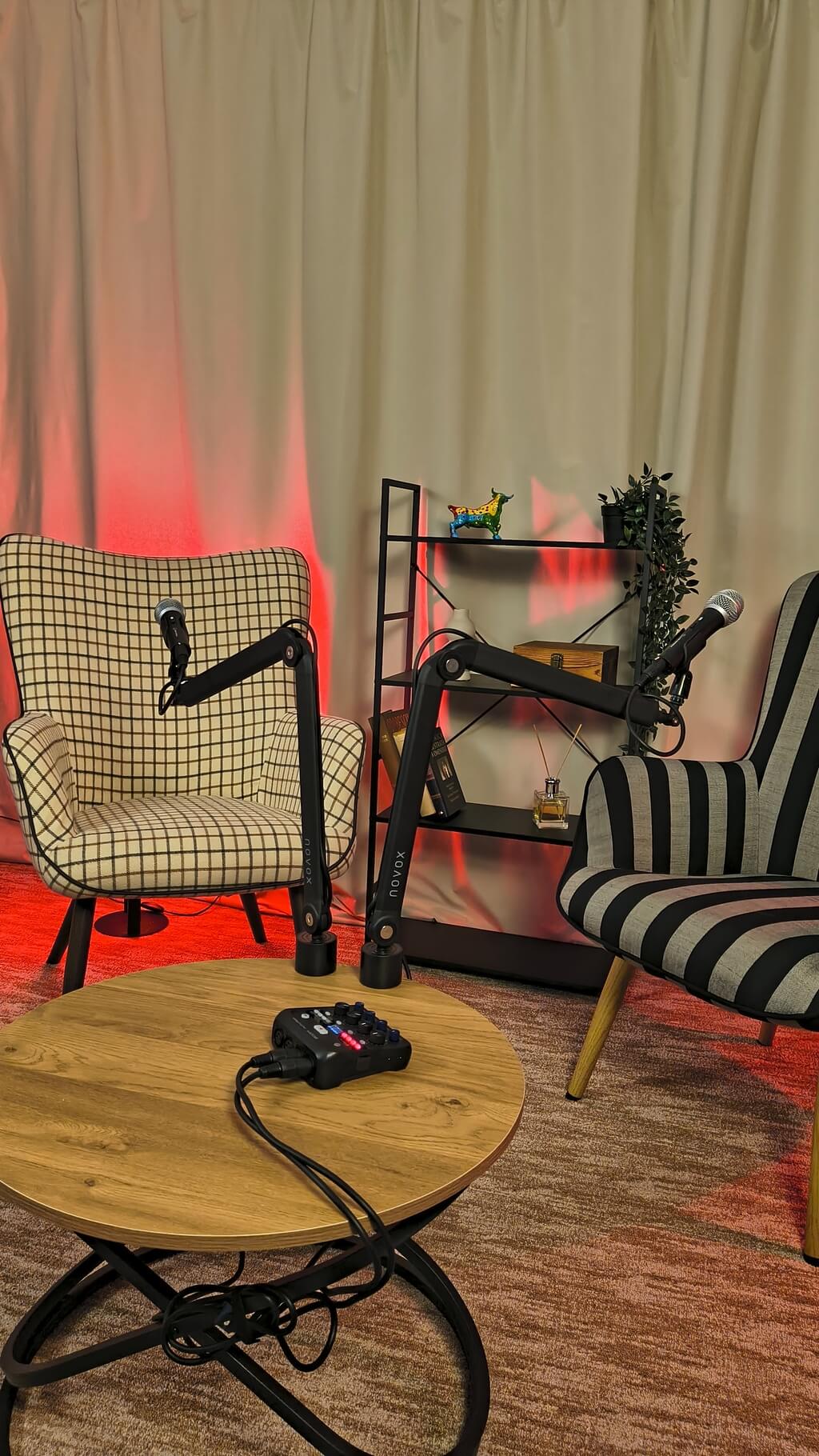 Setup la masa pentru 2 persoane, microfoane separate si sunet curat, intr-un cadru simplu, care lasa conversatia sa fie in centru.